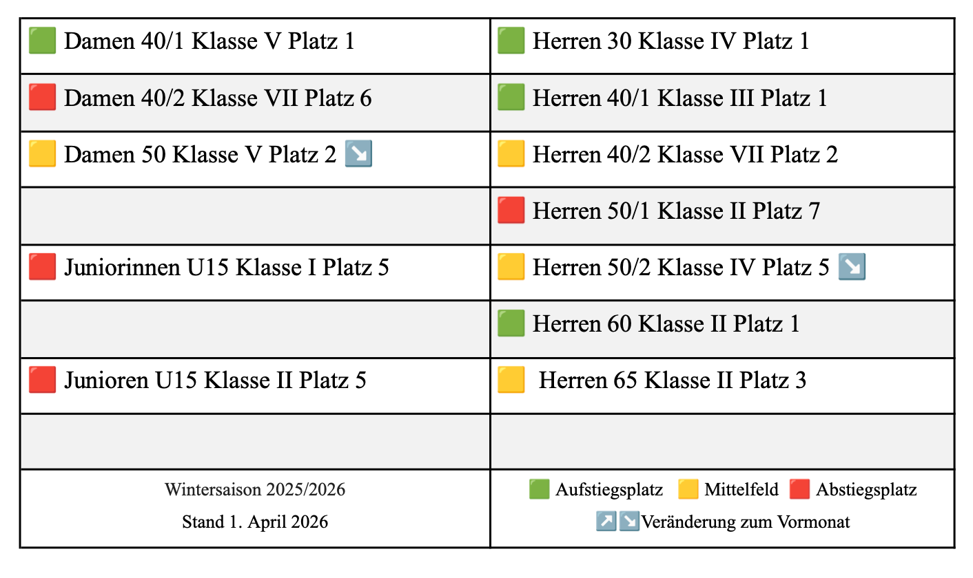 Der schnelle Überblick über die Punktspiele: Wo stehen unsere Mannschaften in der Tabelle? Wer könnte auf-, wer absteigen? Und wer wird wohl die Klasse halten?